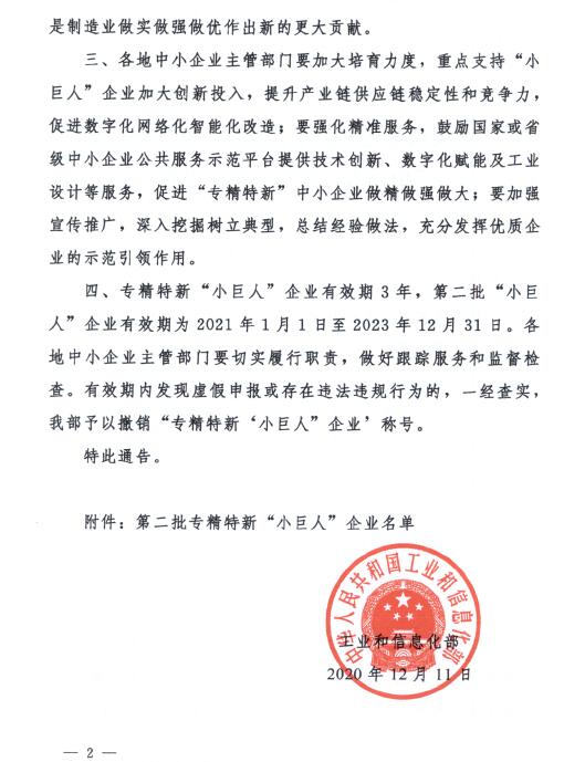 2020年12月,根據(jù)中華人民共和國(guó)工業(yè)和信息化部發(fā)布的通告,思泉新材獲得第二批專精特新“小巨人”企業(yè)的稱號(hào)。