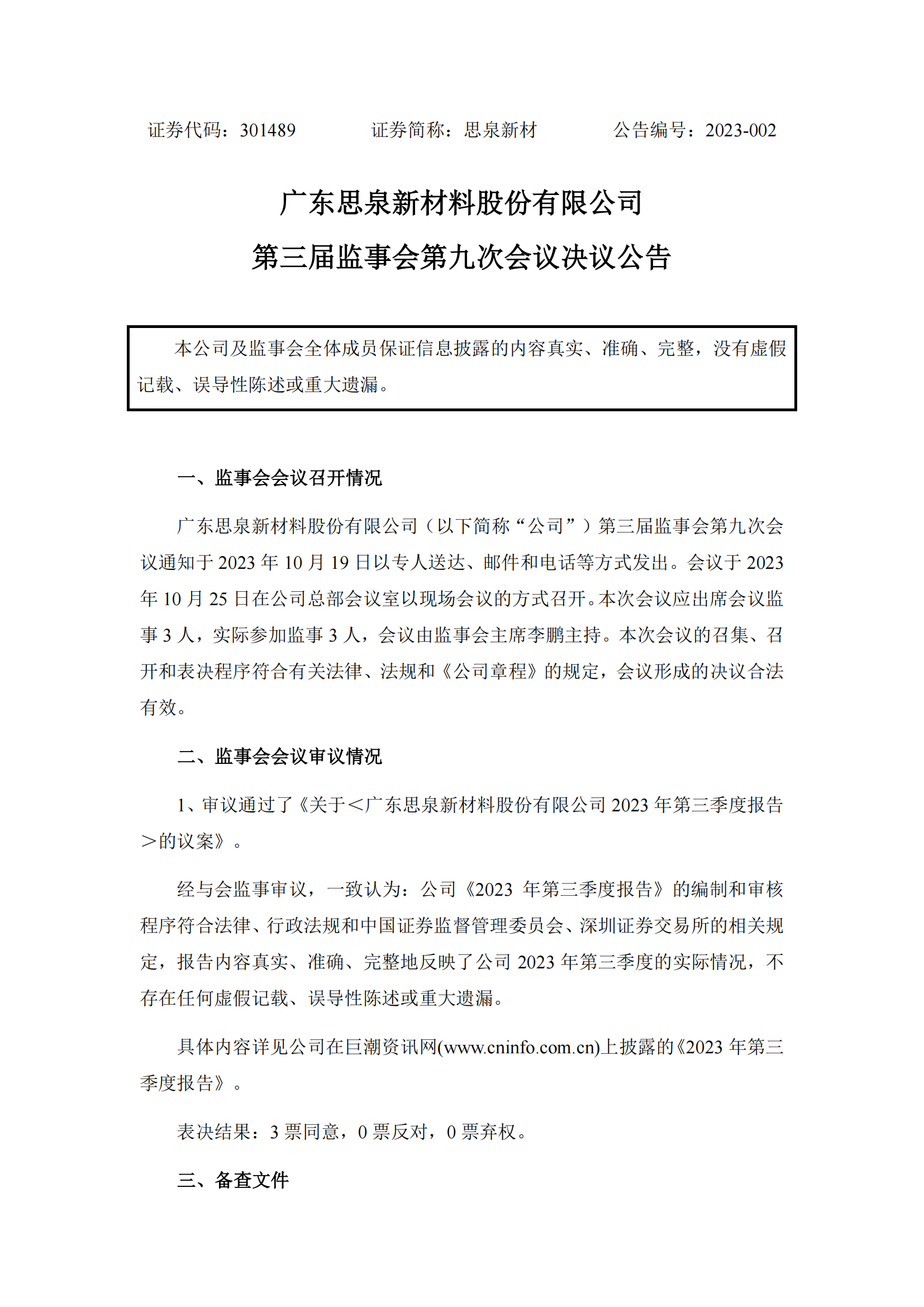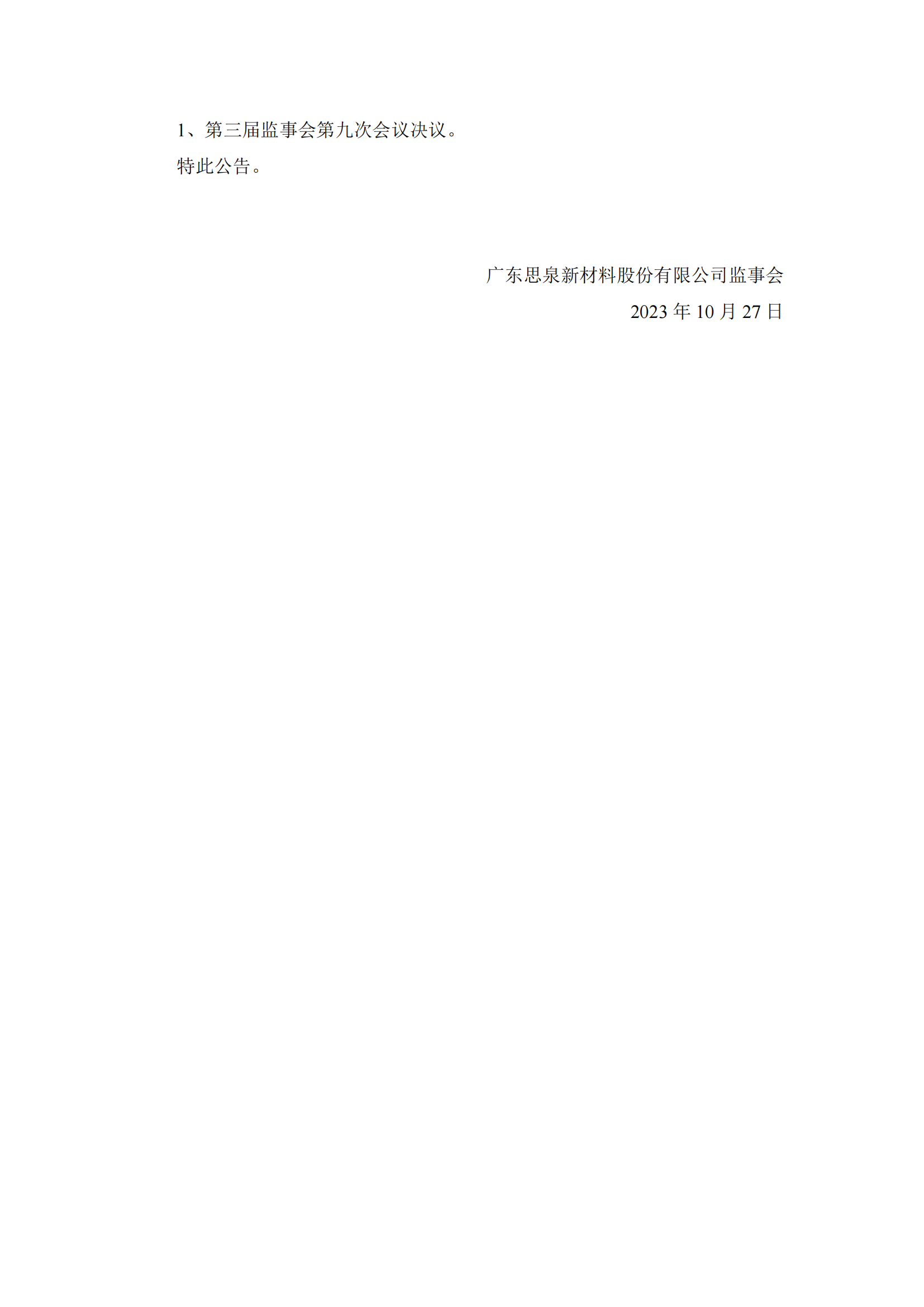 第三屆監(jiān)事會(huì)第九次會(huì)議決議公告