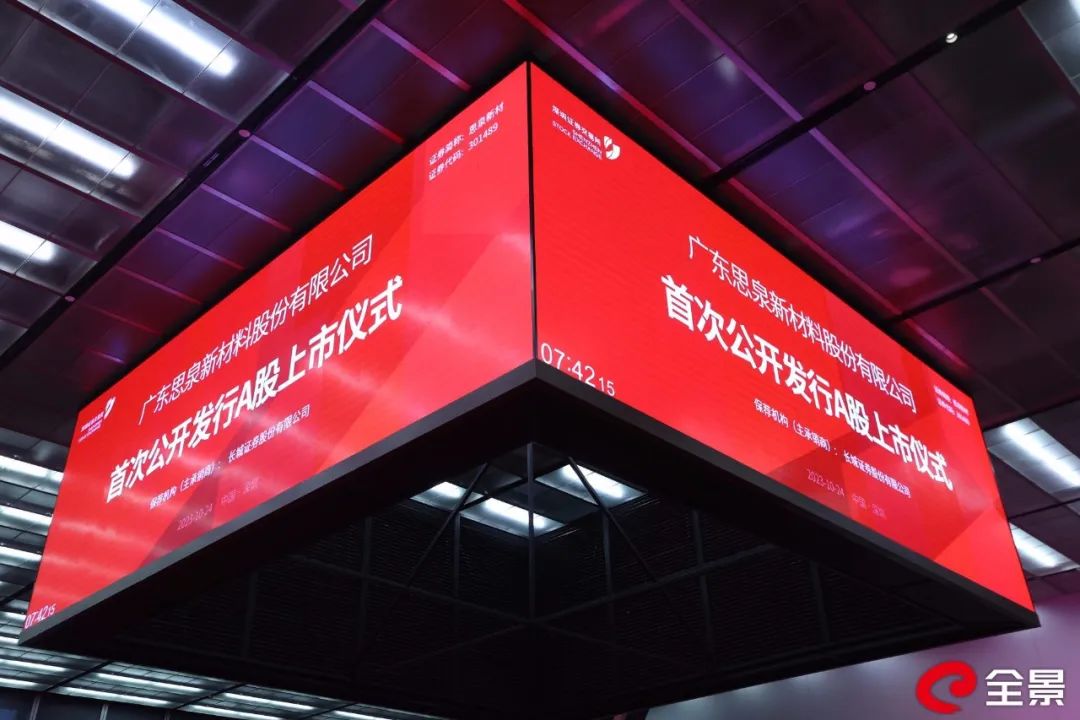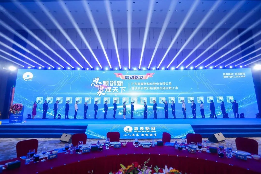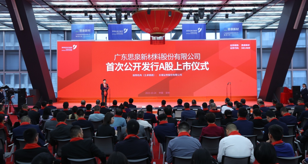 2023年10月24日,廣東思泉新材料股份有限公司(以下簡稱“思泉”)在深圳證券交易所舉行掛牌上市敲鐘儀式,股票簡稱“思泉新材”,股票代碼“301489”。東莞市金融工作局局長鐘正良,企石鎮(zhèn)黨委書記李惠勤,鎮(zhèn)黨委副書記、鎮(zhèn)長袁檢文,副鎮(zhèn)長賴松波等領(lǐng)導,參與思泉上市的各中介機構(gòu)代表、股東代表、合作伙伴代表以及思泉骨干員工應(yīng)邀參加上市儀式及上市答謝晚宴,共同見證了思泉這一重要的歷史時刻。